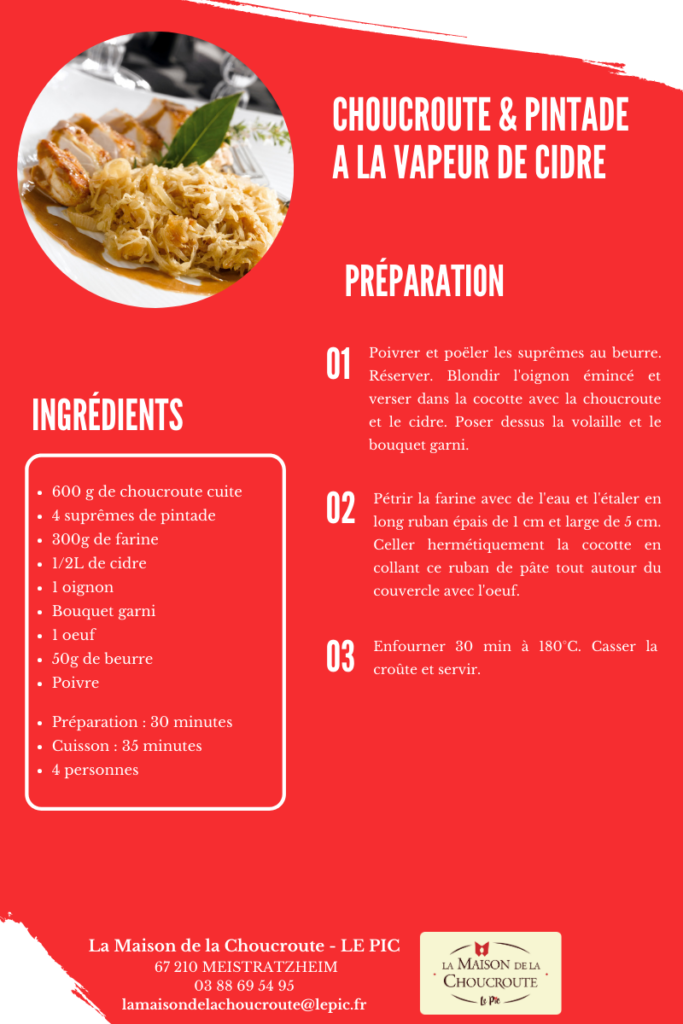 Choucroute & pintade à la vapeur de cidre Publié le 11 janvier 202111 janvier 2021 Télécharger le PDF Navigation de l’articleArticle précédent : Choucroute & brochette de St Jacques