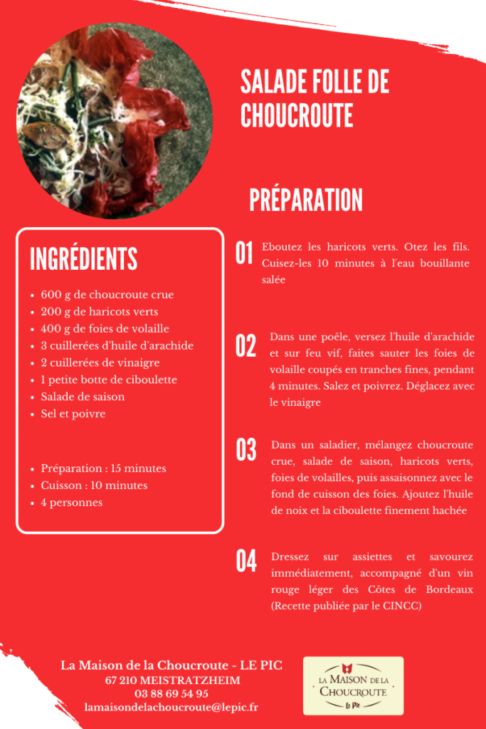 Salade folle de choucroute Publié le 25 novembre 202028 janvier 2021 Télécharger le PDF Navigation de l’articleArticle précédent : Paupiettes de poulet à la choucrouteArticle suivant : Choucroute & brochette de St Jacques